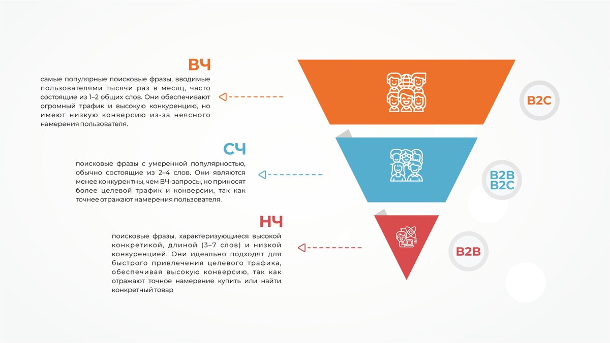 - Характеристика: огромный трафик, но низкая конверсия в покупку. Пользователь только ищет информацию или находится в начале пути.