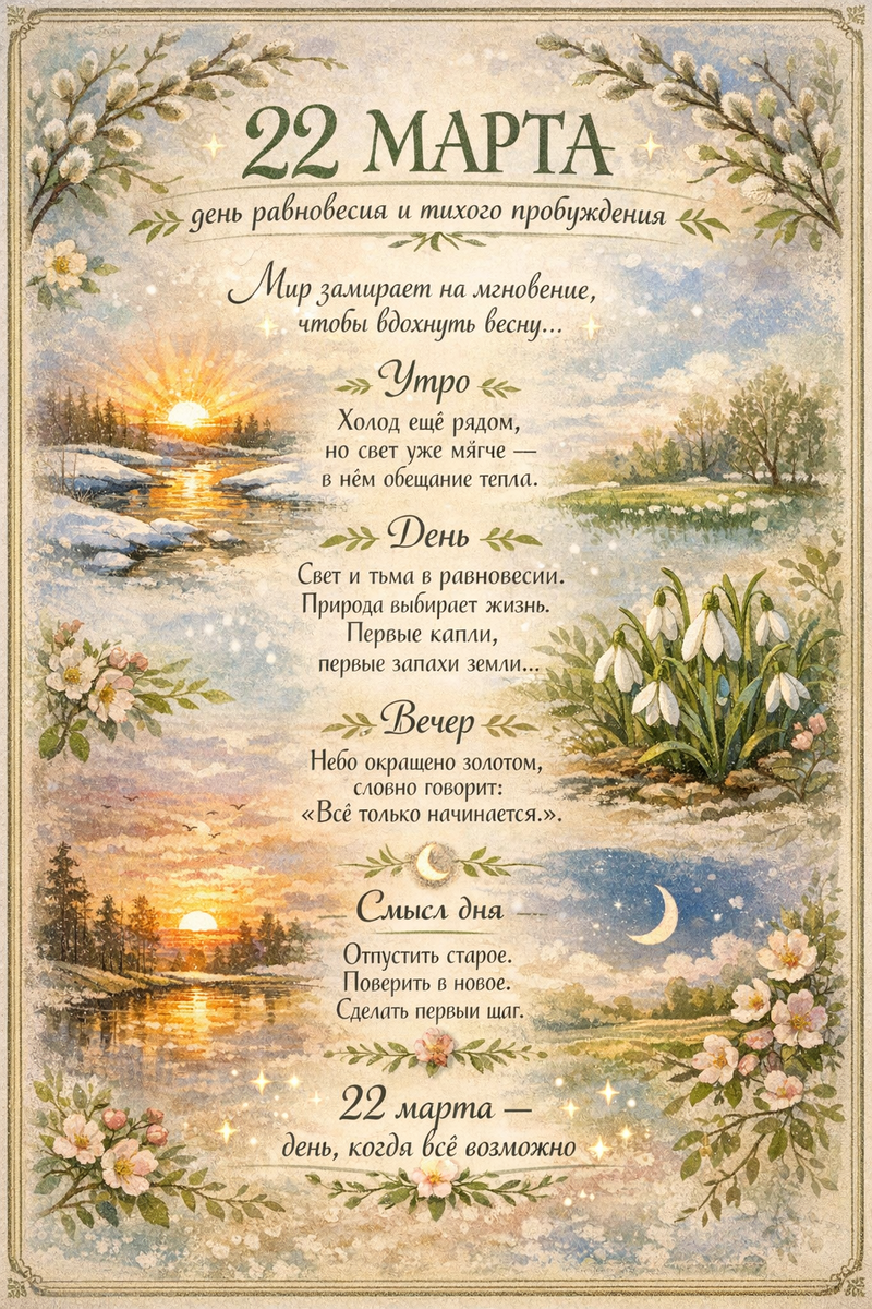 ИИ видит 22 марта как особую точку — почти равновесие между зимой и весной, когда мир словно замирает на мгновение и делает вдох.