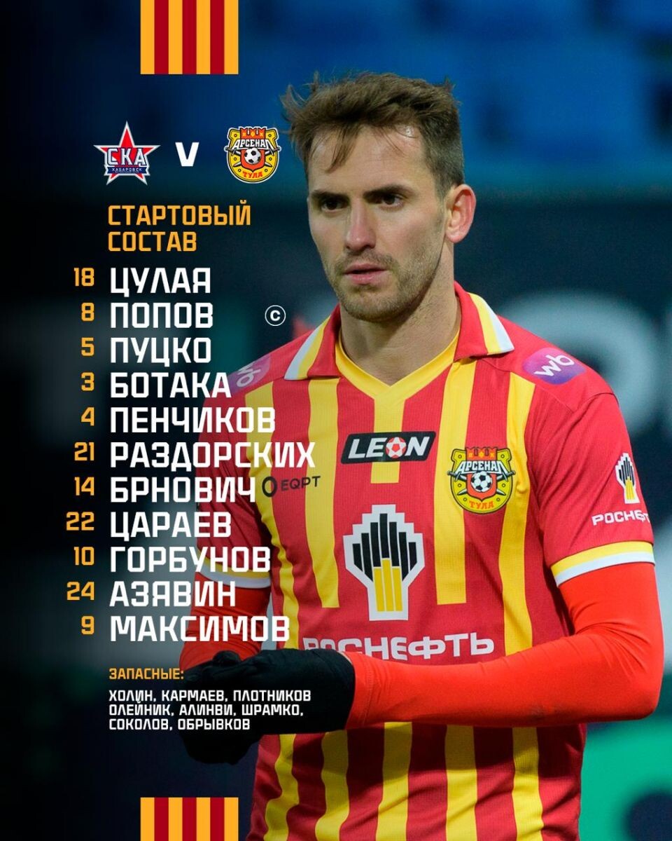 Стартовал матч в рамках первой лиги между командой «СКА-Хабаровск» и тульским «Арсеналом». Стартовые составы команд: футбольный клуб «Арсенал»: Цулая, Попов, Пуцко, Ботака, Пенчиков, Раздорских, Брнович, Цараев, Горбунов, Азявин, Максимов; футбольный клуб «СКА-Хабаровск»: Имамов, Кожемякин, Гребенкин, Шавлохов, Гурбан, Носков, Тур, Алиев, Янов, Глотов, Алкалде. Обслужит матч бригада арбитров во главе с Анопой Антоном (Благовещенск): первый помощник — Шарипов Эдуард (Уфа), второй помощник — Щербаков Степан (Омск), резервный судья — Пожидаев Иван (Комсомольск-на-Амуре), делегат — Крысин Владимир Вячеславович (Хабаровск), инспектор — Голубев Николай (Санкт-Петербург). Ссылка на трансляцию 0+