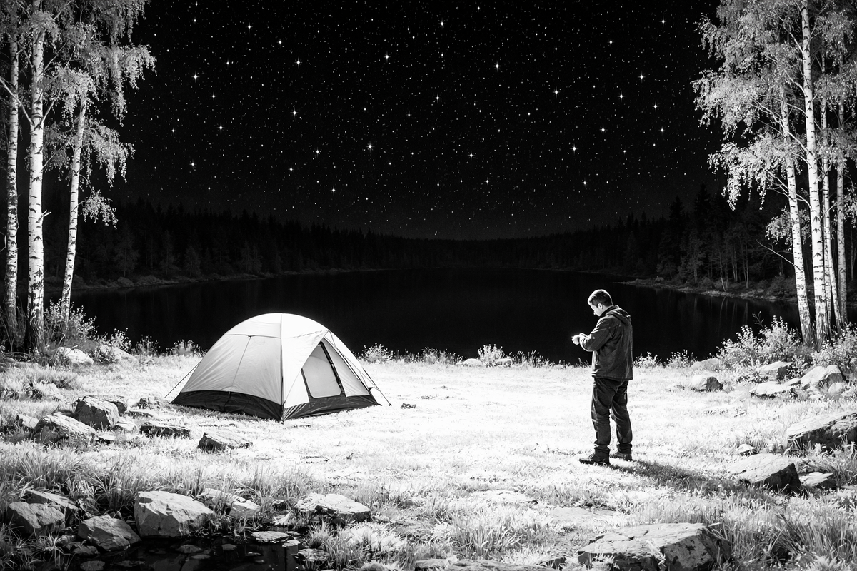 Проснулся я от того, что в палатке было светло. Не от фонаря, не от луны — снаружи что-то светилось. Ровный, белый, холодный свет. Как от прожектора, но без тени — свет шёл отовсюду, как в операционной.