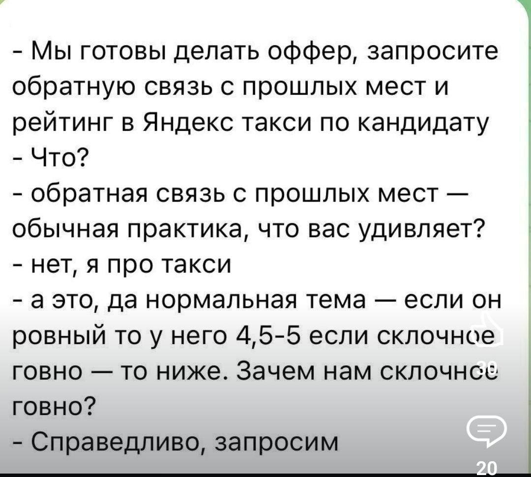 : Уж очень они сильно зовут меня, даже закрались сомнения ))))) Я N не запомнил, поэтому спросил хорошего знакомого, работавшего в ***: Я брал N на свою роль когда уходил из ***. Мы недолго вместе проработали, поэтому сложно давать какие-то рекомендации. Знаю что она долго работала в **. Пробовал с ней несколько раз выйти на связь, она не отвечала на мои сообщения. Я рекомендую поискать кого-то в ** и там спросить обратную связь на неё. По-моему обратная связь👆 однозначно негативна, только с другой стороны, не про склочность. На месте коллеге я бы к такому человеку не пошел.