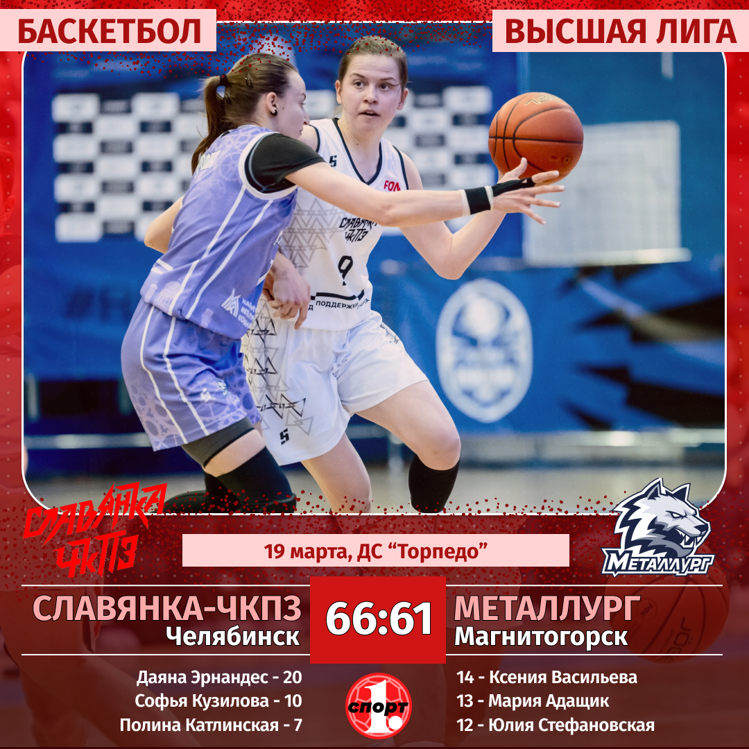 Женская баскетбольная команда «Славянка-ЧКПЗ» завершила регулярный чемпионат в Высшей лиге двумя победами над лидером турнира — магнитогорским «Металлургом» — 66:61 и 85:67. Главной героиней встреч стала Даяна Эрнандес, показавшая фантастическую игру. Результаты матчей не изменили расстановку сил в таблице: магнитогорский клуб занял первое место, челябинская команда финишировала второй, сообщает корреспондент ИА «Первое областное».