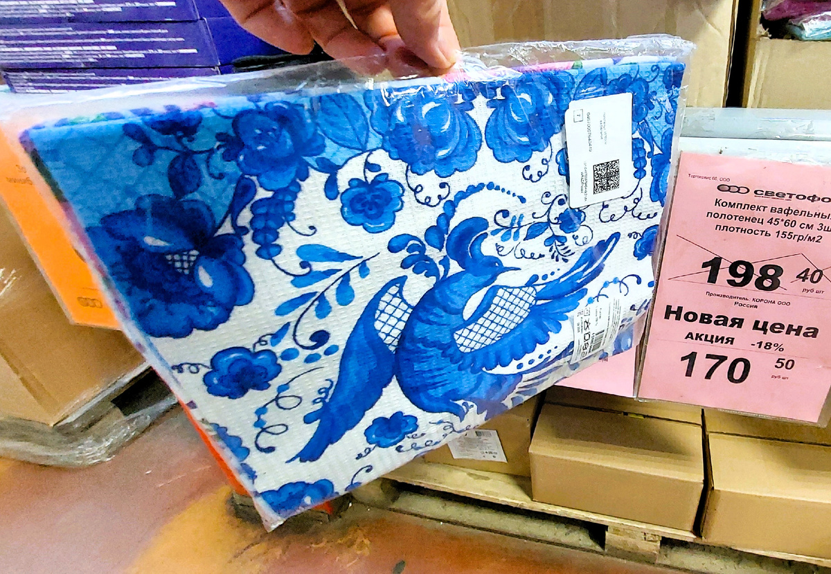 Такую красоту, рисунок Гжель встретила сегодня в магазине "Светофор" и по вполне доступной цене. Пришла сегодня присмотреть и купить что-нибудь на дачу. Но поскольку надо было пройти через отдел текстиля, то мое внимание привлек этот симпатичный Комплект вафельных полотенец из 3х штук, размер 45*60 см. Каждое полотенце имеет петельку для подвешивания, что удобно для кухни. Цена комплекта 170,5 рублей. В инете, я посмотрела, цена превышает 350