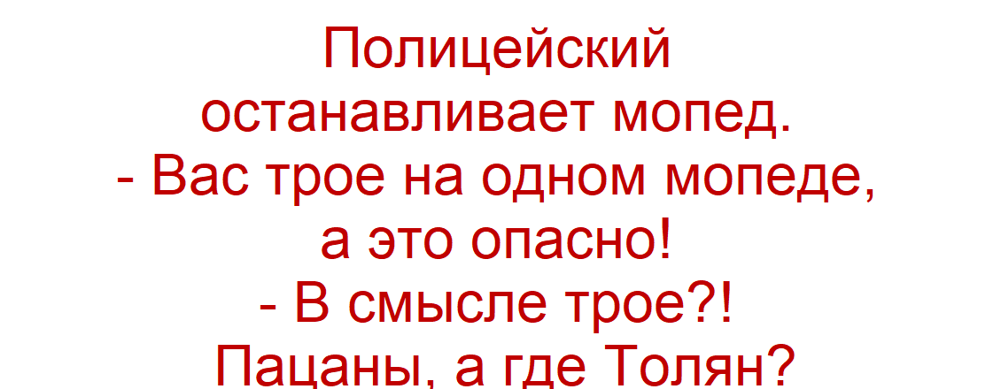 Я мечтаю зарабатывать по десять тысяч долларов в месяц, как мой отец. — Твой отец зарабатывает десять тысяч долларов в месяц? — Нет, он тоже об этом мечтает. Идёт иностранец по рынку. Выбрав один из ларьков, он подходит к нему и спрашивает у русского продавца: — Это что? — Яблоки. — Дайте мне, пожалуйста, килограмм яблок, только каждое яблоко заверните в отдельную бумагу. А это что? — Вишня. — Дайте мне, пожалуйста полтора килограмма вишни, только каждую вишенку заверните в отдельную бумагу. А это что? — Гречка. Не продаётся! Приехал американец в СССР. Захотел пить. Видит — на улице автомат с газировкой. Бросил три копейки — автомат не реагирует. Бросил еще три копейки — автомат ноль эмоций. Еще три копейки — тот же эффект. И это помогло придумать американцу игровой автомат. Мне тут заявляют, что видеомагнитофон в СССР был дефицитом! А сейчас? Объехал все магазины, торгующие техникой, нет видеомагнитофонов совсем! Что на это скажете? Чем лучше сейчас? Единственное, что могло сломаться
