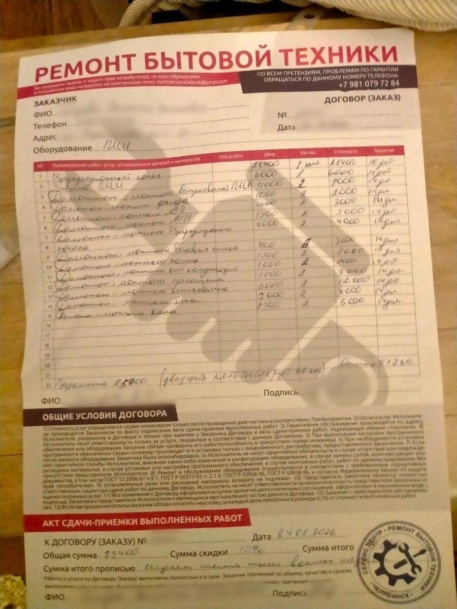 Читательница @74.ru обратилась в сервисный центр Electrolux, чтобы починить импортную посудомойку. В итоге ремонт обошелся дороже новой техники. 💳 Счет на 85 тысяч. Мастер заявил, что сломался насос, забрал посудомойку в ремонт и взял 25 тысяч рублей на замену детали. Пообещал поставить «родной, электролюксовский, из Италии» насос. В итоге уже через три часа сообщил, что всё готово, привез технику обратно и начал заполнять смету. Когда женщина увидела итоговую сумму, решила, что у нее двоится в глазах: мастер выставил счет на 85,4 тысячи рублей. В итоге она заплатила наличкой 76,8 тысячи рублей, специалист сделал скидку, как пенсионерке. Эти деньги она откладывала на операцию. Недостающую тысячу мастер попросил перевести по номеру телефона. По словам женщины, мужчина давил на нее, а вызвать полицию она не решилась — была одна в квартире. Старую деталь мастер не оставил, чек на новую не показал. «Если бы можно было хотя бы привлечь к ответственности бессовестных людей, которые таки