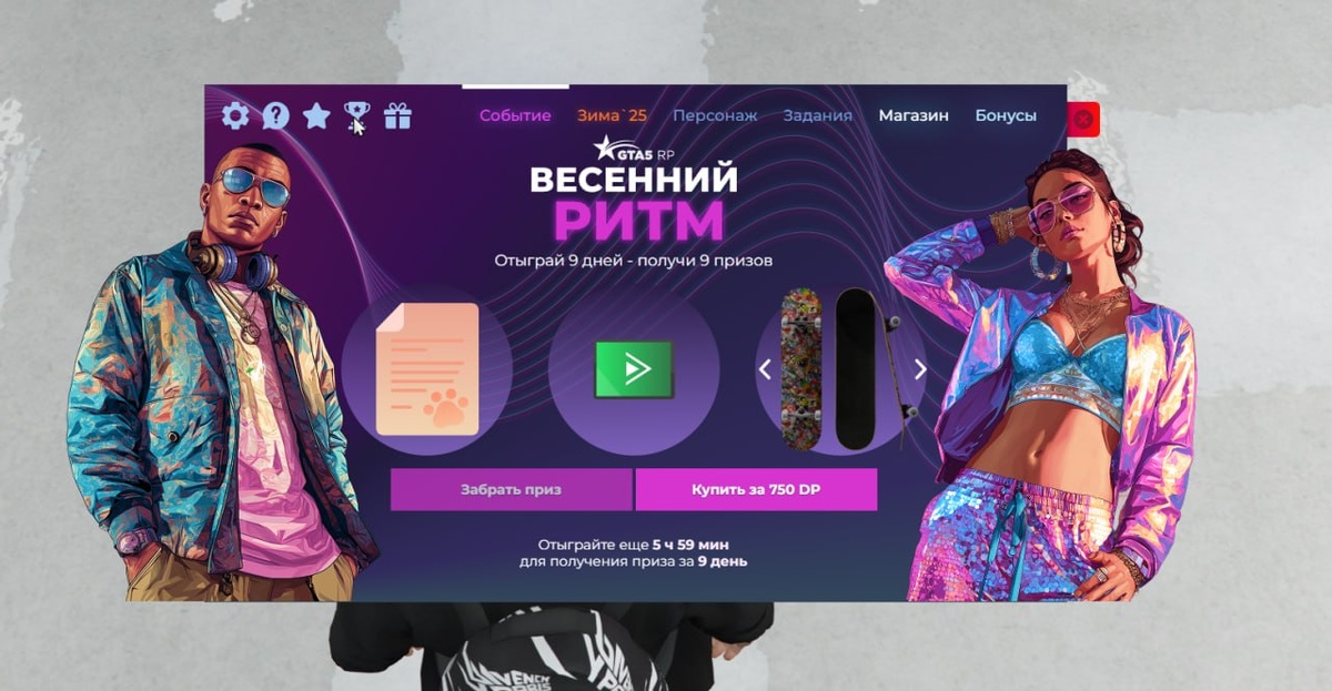За девятый день ивента «Весенний ритм» на GTA 5 RolePlay можно получить заявление об опеке над животным ИЛИ CarPlay или скейтборд. Призы за пропущенные дни можно будет купить по 750 DP за каждый день.
