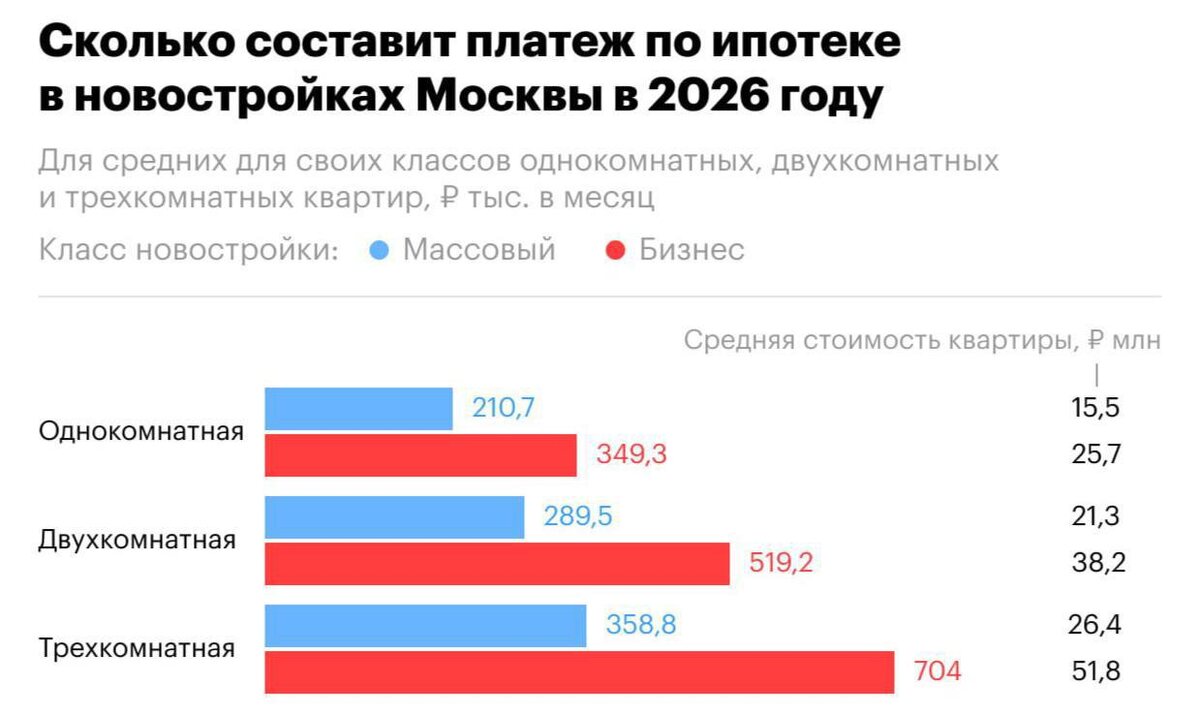 При ипотеке на 20 лет и первоначальном взносе 20% ежемесячный платеж за однокомнатную квартиру составит ~210 700 ₽, а средняя зарплата ~170 900 ₽. Для двухкомнатной квартиры платеж может достигать 289 500 ₽, для трехкомнатной — 358 800 ₽. Москва. Новости 24/7