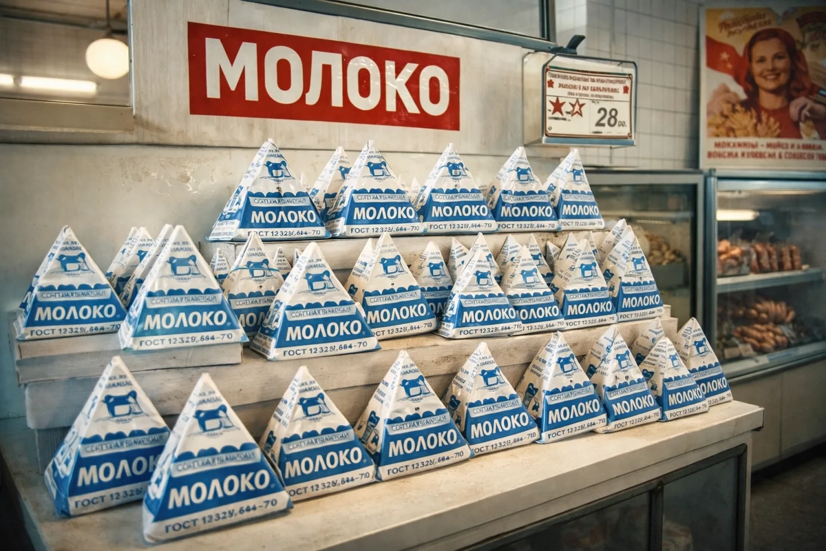 Если спросить людей, выросших в СССР, какой у молока был «вкус детства», многие вспомнят не только само молоко, но и упаковку. Тот самый мягкий пакет в форме пирамидки, который ставили на стол, прокалывали уголок ножницами и старались налить в стакан так, чтобы не устроить молочное наводнение. Эти треугольники помнят почти все. И у многих возникает вопрос: если упаковка была такой узнаваемой, почему от неё в итоге решили отказаться? На самом деле молоко в треугольниках появилось не просто так. После войны в стране остро стояла задача быстро и массово наладить упаковку продуктов. Стеклянные бутылки требовали мытья, возврата тары и сложной логистики. А бумажная упаковка казалась отличным решением. Технологию подсмотрели на Западе. В 1940-е годы шведская компания разработала систему упаковки молока в картонные пирамидки. Машины складывали из специального ламинированного картона треугольные пакеты, заполняли их молоком и запаивали. Такая форма оказалась удобной для производства: минимум шв