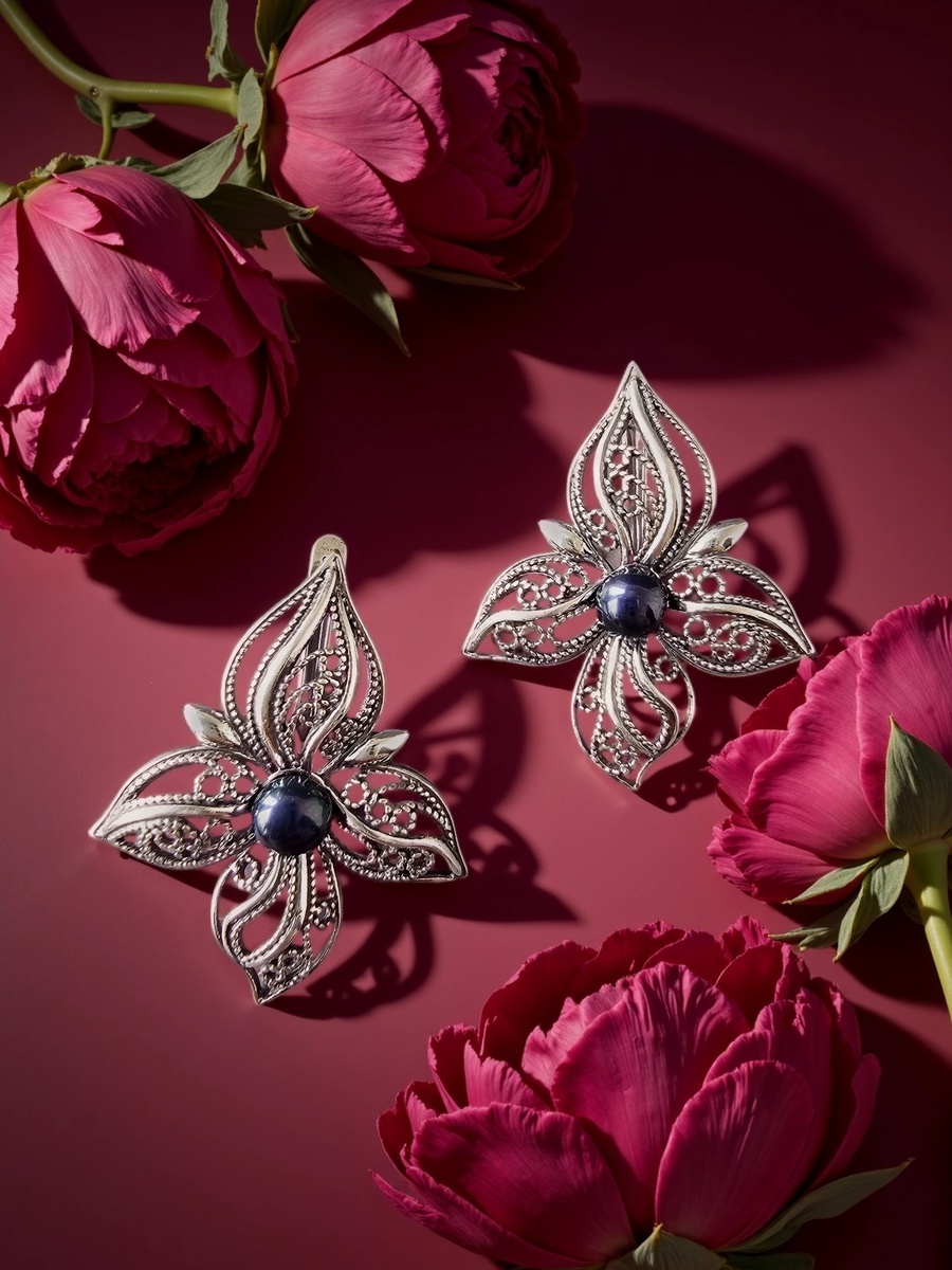 В коллекции «Изгиба Обаяния» этот тренд читается безупречно. Посмотрите на серебряные серьги-кокошники: тончайшая филигрань и благородное чернение создают узнаваемый силуэт. Они не выглядят старомодно, наоборот — их строгая геометричная форма с внутренним кружевом металла работает как роскошный акцент даже с лаконичным весенним пальто.