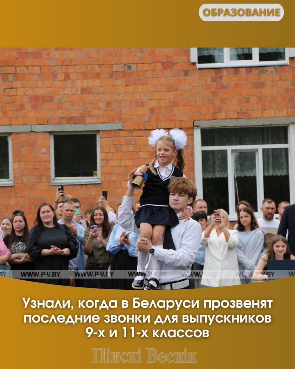 ⏩Торжественные мероприятия «Последний звонок» для выпускников 9-х и 11-х классов пройдут 23 мая. Для этой категории учащихся учебные занятия завершатся 25 мая, для всех остальных — 29 мая. ⬇️Выпускные вечера для 11-классников рекомендуется провести 12 июня. @Пинский Вестник 📱Ютуб 📱ВК 📱ИНСТАГРАМ 📱ОК 📱ФЕЙСБУК 📱ТИК ТОК Прислать новость