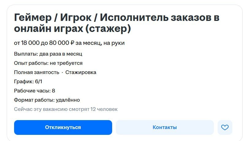 На hh.ru ищут стажёра в онлайн-игры с зарплатой до 80 тысяч рублей. ⠀ Опыт не нужен, образование тоже — достаточно просто уметь «жать на кнопки». В обязанности входит выполнение заказов внутри игровых миров. График суровый: шесть рабочих дней в неделю, зато потолок по деньгам вполне взрослый — от 18 до 80 «кусков» на руки. ⠀ Пока родители ворчали, что компьютерные стрелялки не прокормят, рынок решил иначе. Теперь главное, чтобы у стажёра после такой смены не началось отторжение реальности и не затекли пальцы. ⠀ Мама, я не бездельничаю, я на испытательном сроке в эльфийском спецназе.
