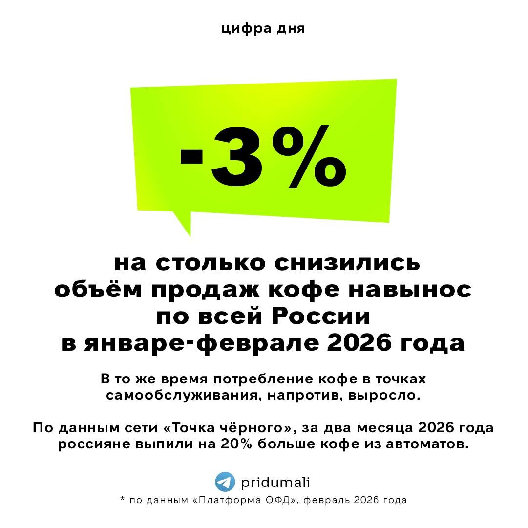 В рубрике «Цифра дня» данные ПЛАТФОРМЫ ОФД — на 3% сократились продажи кофе на вынос за январь-февраль 2026 года по сравнению с аналогичным периодом 2025 года. Также причиной снижения спроса на горячий кофе стало закрытие части кофеен. Ряд игроков в сегменте не выдержали конкуренции, в том числе из-за растущей популярности домашнего приготовления кофе. В то же время потребление кофе в точках самообслуживания, напротив, выросло. Рост потребления кофе из автоматов — тенденция последних лет, связанная с изменением потребительских привычек и развитием кофейного оборудования. 👉подписаться на @pridumali #исследования