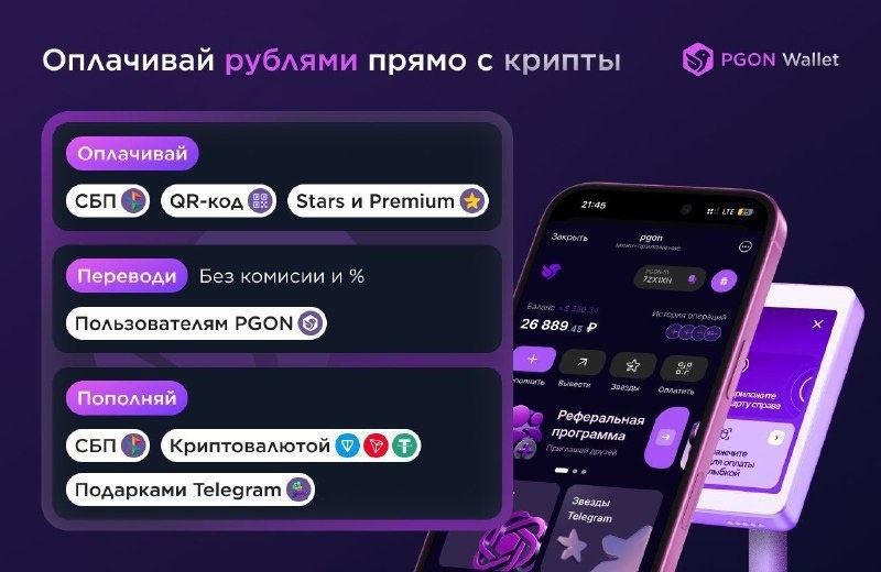 ? PGON Wallet делает все автоматически: вы пополняете любой криптой, а система сама конвертирует в рубли и оплачивает по QR. Также у них есть удобный вывод в РФ — на карту или по номеру телефона. И что важно: перевод приходит от юрлица, а не по P2P от неизвестного физлица, что для банка выглядит гораздо спокойнее. ✍️ Еще из преимуществ: • пополнение криптой – 0% • пополнение и оплата по QR СБП – 3% • пополнение подарками – 0% • вывод СБП – 3,5% • быстро, анонимно и все прямо в Telegram • возможность оплачивать покупки в обычных магазинах Теперь крипта работает на вас даже в обычных магазинах. Оцените сами: @PGON 👌 #реклама Дисклеймер Antarctic Wallet позволяет оплачивать любые покупки криптовалютой через QR-код Antarctic Wallet