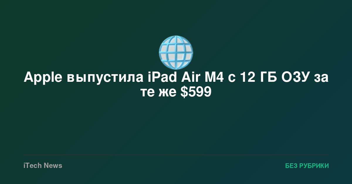 Apple представила обновлённый iPad Air с чипом M4 и увеличенной оперативной памятью, сохранив прежние ценники — $599 за 11-дюймовую модель и $799 за 13-дюймовую. По сути, это единственные значимые изменения в новом поколении планшета. iPad Air традиционно занимает промежуточное положение между базовым iPad и профессиональным iPad Pro. На этот раз Apple ограничилась минимальным апдейтом — новый чип и больше памяти, больше никаких сюрпризов. Главное отличие нового iPad Air — переход с чипа M3 на M4 и увеличение оперативной памяти с 8 до 12 ГБ. Apple заявляет, что M4 на 30% быстрее предшественника — солидный прирост для тех, кто занимается видеомонтажом или другими ресурсоёмкими задачами. Дополнительная память особенно пригодится владельцам, которые активно используют Apple Intelligence. Новый планшет также получил чип N1 для поддержки Wi-Fi 7 и Bluetooth 6 — скорость передачи этих выросла с 9,6 до 46 Гбит/с. (Для справки: Wi-Fi 7 — новейший стандарт беспроводной связи, обеспечивающий в п