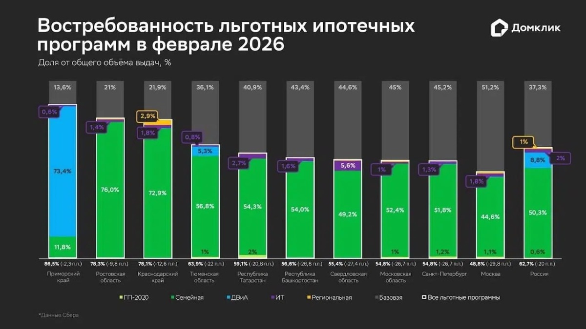 Несмотря на снижение выдач по льготным программам до ₽131,5 млрд к январю 2026 года, это все еще на 26,6% больше, чем за аналогичный период прошлого года. Объем спроса вырос до ₽78,3 млрд. Чаще всего по рыночным ставкам россияне берут жилье на вторичке — 65–70% от общего объема выдач по базовым программам. За февраль 2026 года было оформлено займов на сумму в ₽53 млрд на вторичный рынок — в 4,7 раза больше чем в феврале 2025 года. Белая Каска в Max