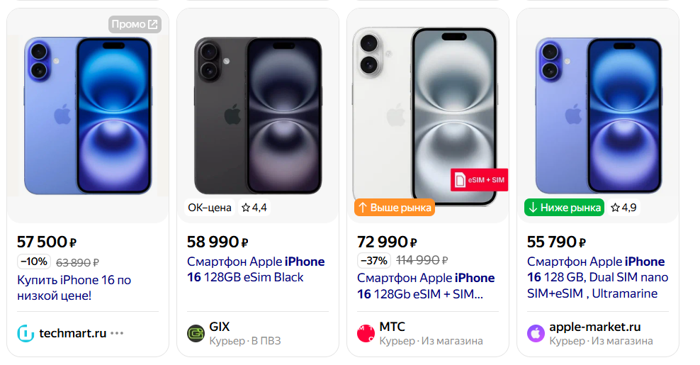 На момент написания публикации iPhone 16 можно было купить примерно за 56.000 рублей с базовой комплектацией памяти 128 ГБ.