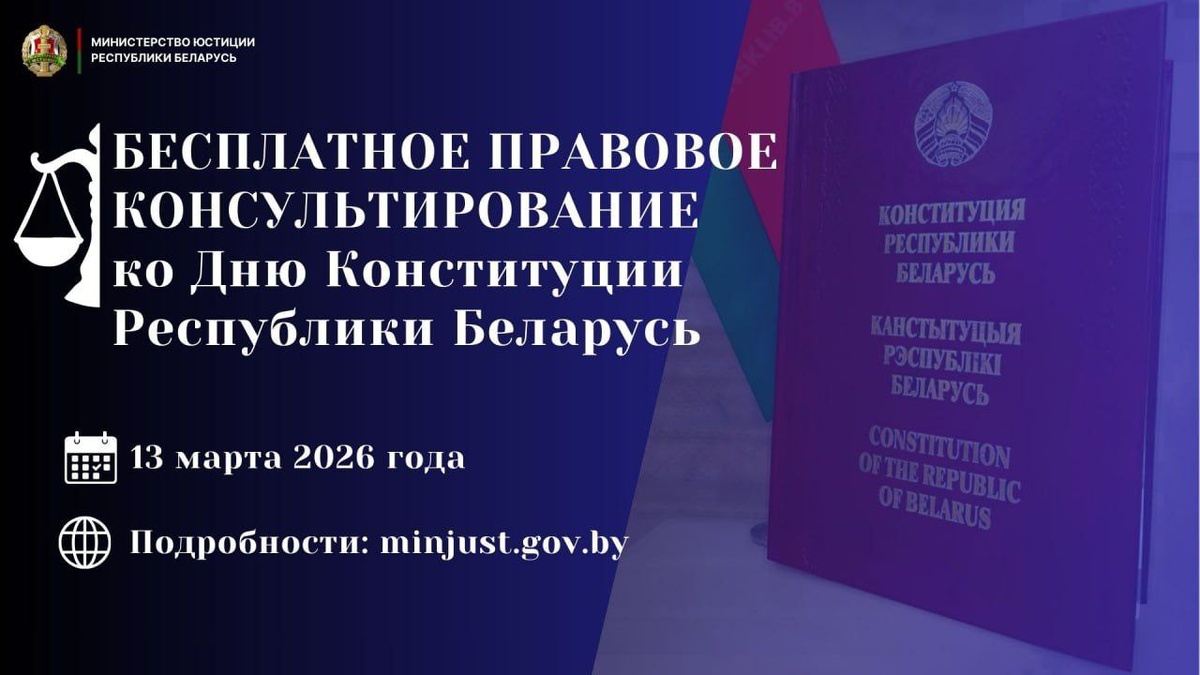 с 10.00 до 12.00 Министерство юстиции проведет в формате прямой телефонной линии акцию по бесплатному консультированию граждан, приуроченную ко Дню Конституции. ⚡️В ходе консультирования граждане смогут получить ответы на интересующие их вопросы, не требующие ознакомления с документами, в сферах: ◾️нотариальной деятельности – тел. 8 (017) 211 01 85; ◾️легализации (апостилирования) официальных документов, составленных на территории Республики Беларусь – тел. 8 (017) 211 01 93; ◾️принудительного исполнения исполнительных документов – тел. 8 (017) 210 40 49. ❕Также участие в акции примут специалисты главных управлений юстиции облисполкомов и Мингорисполкома, адвокаты и нотариусы. 🌱Подробности на нашем сайте minjust.gov.by 💪💪💪💪| Сайт | Telegram | Instagram | YouTube