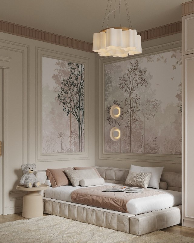 Это ключевой декоративный элемент. Живописный лес, деревья, полевые травы – они вписаны в рамки молдингов и превращают стену в арт-объект. Рисунок не кричит, он шепчет, но именно он задает настроение всей комнате.