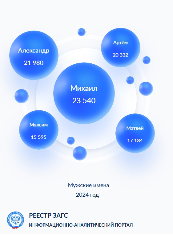 МИХАИЛ последние годы упорно удерживает 1-е место в мужском именнике России. Царственное по натуре (как имя русских князей и царей) оно будто и должно быть всегда №1, не оставляя альтернативы.