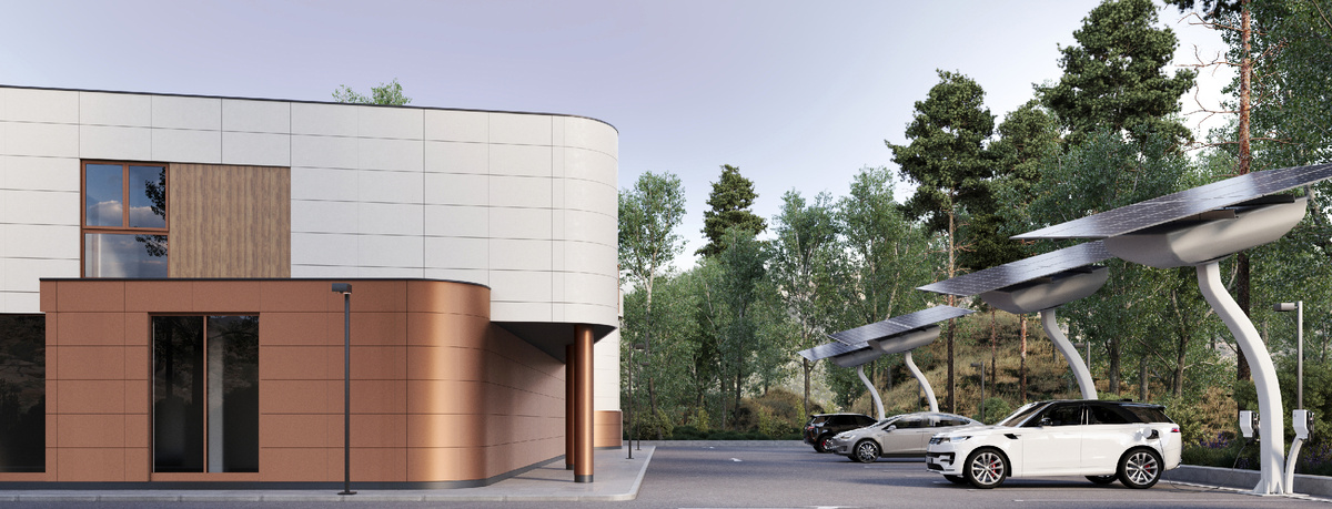Локация: Юг России, Краснодарский край Метраж: 1165,4 кв. м Заказчик этого проекта решил открыть заправочную станцию для электрокаров. Пространство представляет собой «заправку нового поколения», где в распоряжении гостей оказываются не только сами зарядные устройства, но также магазин, фуд-корт и отдельные номера. Все функциональные зоны отличает максимальная автоматизация: в лобби интегрирована система самостоятельной регистрации в отель, а в торговый зал — кассы самообслуживания. В случае затруднений, посетителям всегда сможет помочь представитель службы охраны, для которого команда Точки дизайна предусмотрела стойку на первом этаже. Отправной точкой для визуальной концепции стал символ бесконечности, требующий от дизайнеров филигранно выверенных пропорций. Благодаря обтекаемой геометрической форме в проект пришли мягкие углы и гибкие линии: в основу архитектуры здания лег образ двух объемов, смещенных относительно друг друга. Единство этой композиции подчеркивают фиброцементные па