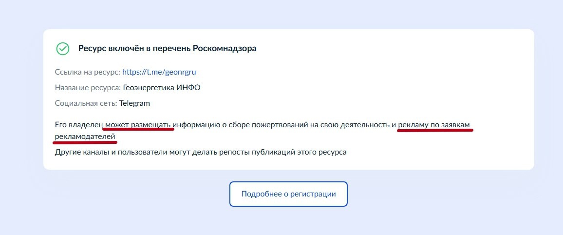 : В связи с принятием Роскомнадзором мер по ограничению доступа к социальным платформам Instagram* и Facebook*, видеохостингу YouTube, VPN-сервисам, мессенджерам Telegram и WhatsApp ФАС России усматривает в размещении рекламы на данных ресурсах признаки нарушения части 10.7 статьи 5 федерального закона «О рекламе». Согласно норме, нельзя размещать рекламу на ресурсах организаций, деятельность которых признана нежелательной в России, либо ликвидированных судом за экстремизм или терроризм. Кроме того, запрещается реклама на информационных ресурсах, доступ к которым ограничен в соответствии с законодательством На скрине специально для ФАС информация. На фоне происходящего мракобесия, Геоэнергетика ИНФО есть в MAX https://max.ru/geonrgru *Принадлежат Meta, которая признана экстремистской и запрещена в РФ @geonrgru | 🇷🇺 MAX | sponsr.ru