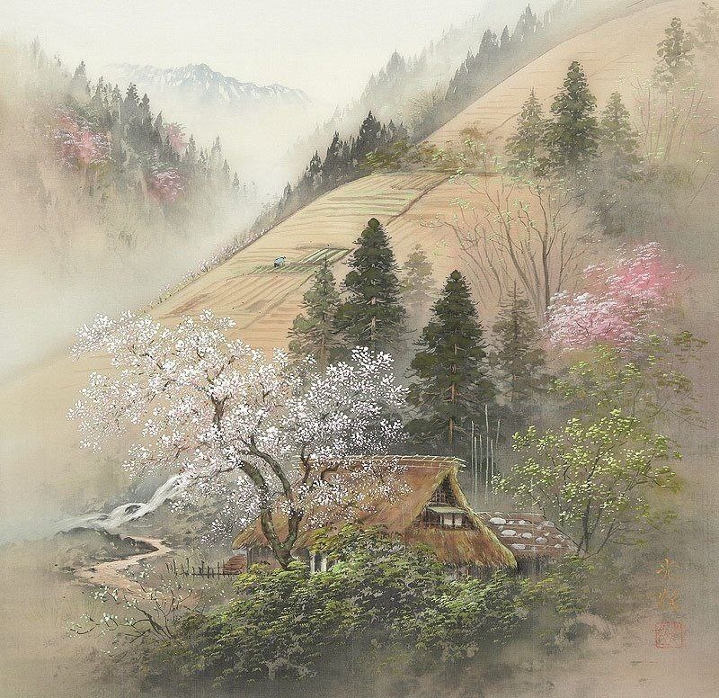 ΡΠ΄ΠΎΠΆΠ½ΠΈΠΊ-ΠΏΠ΅ΠΉΠ·Π°ΠΆΠΈΡΡ, ΠΏΠΈΡΡΡΠΈΠΉ Π² ΡΡΠΈΠ»Π΅ Β«ΡΠ°Π½ΡΡΠΉΒ». Π’Π΅ΡΠΌΠΈΠ½ Β«ΡΠ°Π½ΡΡΠΉ-Π³Π°Β» Π² ΡΠΏΠΎΠ½ΡΠΊΠΎΠΉ ΠΆΠΈΠ²ΠΎΠΏΠΈΡΠΈ ΠΎΠ·Π½Π°ΡΠ°Π΅Ρ Β«ΠΊΠ°ΡΡΠΈΠ½Ρ Π³ΠΎΡ ΠΈ Π²ΠΎΠ΄Β». Π ΡΠΎΠΎΡΠ²Π΅ΡΡΡΠ²ΠΈΠΈ ΡΠΎ ΡΡΠΈΠ»Π΅ΠΌ Β«ΡΠ°Π½ΡΡΠΉΒ» ΠΠΎΡΠΊΠ΅ΠΈ ΠΠΎΠ΄Π·ΠΈΠΌΠ° ΠΈΠ·ΠΎΠ±ΡΠ°ΠΆΠ°Π΅Ρ ΠΈΠ΄Π΅Π°Π»ΡΠ½ΡΡ Π―ΠΏΠΎΠ½ΠΈΡ Ρ Π½Π΅ΠΏΠΎΠ΄Π²Π»Π°ΡΡΠ½ΠΎΠΉ Π²ΡΠ΅ΠΌΠ΅Π½ΠΈ ΠΊΡΠ°ΡΠΎΡΠΎΠΉ Π³ΠΎΡΠ½ΡΡ