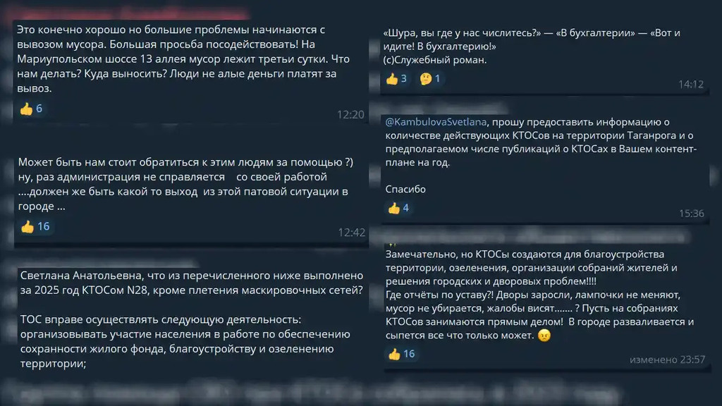 Грязь никуда не делась. Зато есть публикации про волонтёров. Пока городские улицы ждут уборки — снег сошёл уже несколько недель назад, после него осталось всё, что обычно остаётся — Telegram-канал главы города живёт насыщенной жизнью. Волонтёры, молодёжные мероприятия, КТОСы, помощь фронту. Публикации выходят регулярно и с воодушевлением. Жители Таганрога волонтёрский труд оценивают высоко. Вопрос у них другой. В комментариях под постами про КТОСы горожане любезно процитировали техническую документацию — чем именно эти структуры должны заниматься. Выяснилось, что значительная часть их обязанностей — это как раз благоустройство подконтрольных территорий и наведение порядка в городе. Не плетение маскировочных сетей — при всём уважении к этой работе — а вполне конкретные коммунальные задачи. Которые, судя по состоянию улиц, пока остаются в режиме ожидания. Возникает закономерное наблюдение: Telegram-канал главы города всё меньше касается того, что непосредственно входит в обязанности