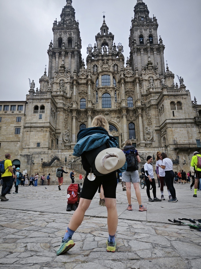 Я дошла! Вообще я не хотела сегодня стартовать рано. Немного сбили планы мне мои соседи по альберге, мы с ними как-то не ужились. Они были с чемоданами, заняли все пространство, использовали мой второй ярус и лестницу как сушку для своих вещей и после 22 включали видео со звуком и громко разговаривали. Так что с утра я не стала задерживаться в этой компании и вышла достаточно рано. Но все равно не стала спешить к мессе в 12, на ней я уже была и сегодня планировала посетить вечернюю. Основные толпы ещё не вышли, а те что были я обогнала и вышла в достаточно спокойный промежуток. Людей все равно было достаточно, но их было не сильно больше, чем в обычный день на Камино. По ходу маршрута я сделала небольшое отклонение до знакового монумента пилигримов, смотрящих на город. В хорошую погоду тут видно шпили собора. Но сегодня погода была туманная, но думаю не будет спойлером что собор я сегодня всё-таки увидела. В итоге, с двумя остановками на какао и монумент, в 12.30 я уже была у собора. Н