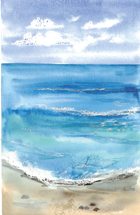 Тёмно-коричневым по сухому рисуем мелкие камешки и усиливаем линию прибоя (можно наклеить скотч по горизонту для ровной линии).