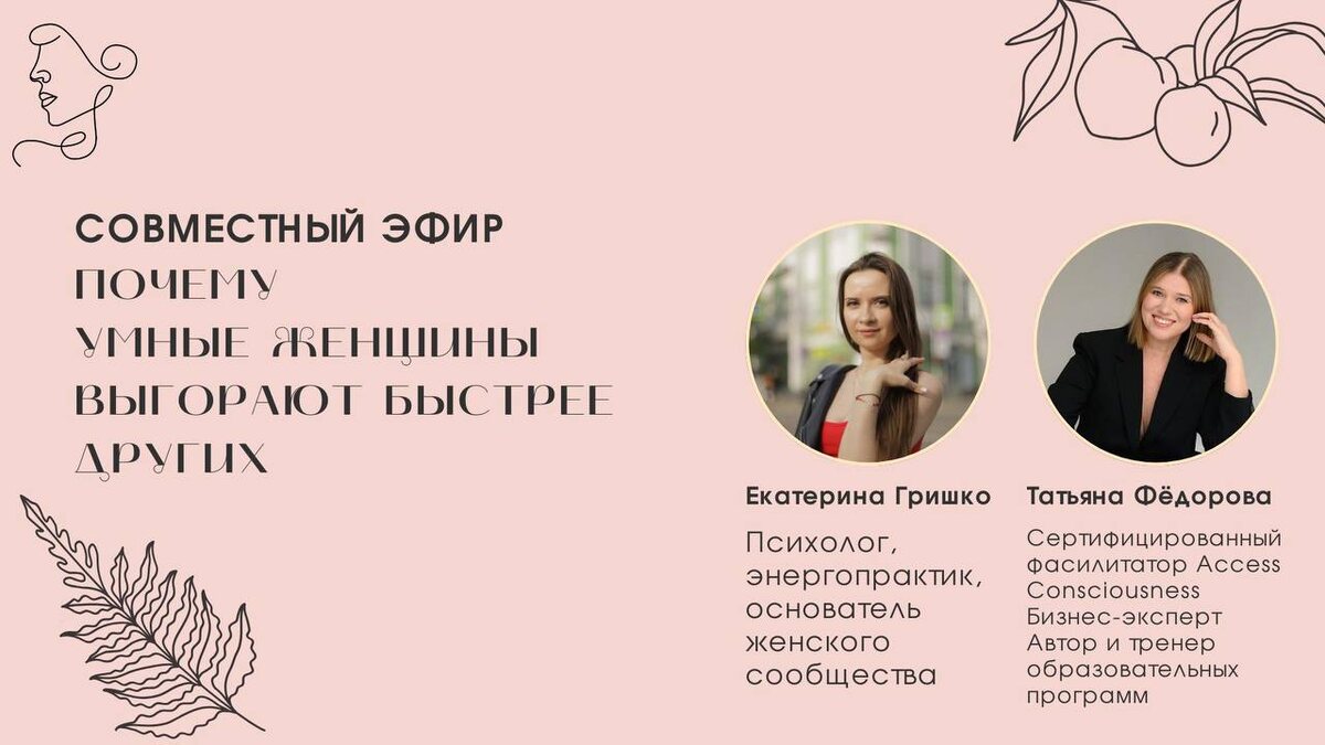 Совместный прямой эфир 📌11 марта, 17:00 по Мск ☀ Что обсудим: ➡ Почему высокий интеллект и осознанность часто приводят не к лёгкости, а к хронической усталости. ➡«Если не я, то кто?» — почему именно умные женщины чаще берут на себя ответственность за всех вокруг. ➡ Почему способность быстро видеть проблемы превращается в постоянное внутреннее напряжение. ➡ Что становится главной причиной выгорания. ➡ Почему умные женщины почти не умеют расслабляться. ➡ Нужно ли «становиться проще», чтобы перестать выгорать. ➡ Можно ли сохранить свой ум и глубину, но при этом перестать жить в постоянном напряжении. ➡ Какие практические шаги помогают перезагружать голову и восстанавливать ресурс. ☀ Эфир для вас проведут: 🎙 Екатерина Гришко vk.com/woman_real_psy — психолог, гипнолог, энергопрактик, основатель женского сообщества. 🎙 Татьяна Фёдорова vk.ru/tatiana_tainagizni — сертифицированный фасилитатор Access Consciousness, бизнес-эксперт, автор и тренер образовательных программ 🔔 P.S. Если не с