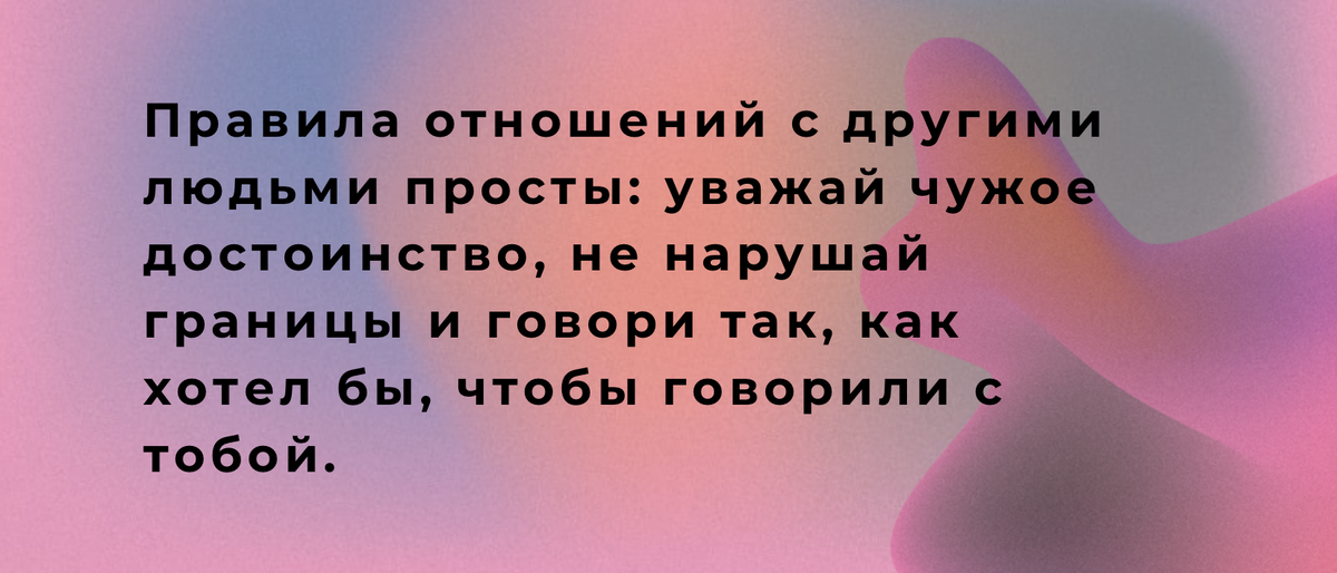 Правила отношений с другими людьми просты: уважай чужое достоинство, не нарушай границы и говори так, как хотел бы, чтобы говорили с тобой.