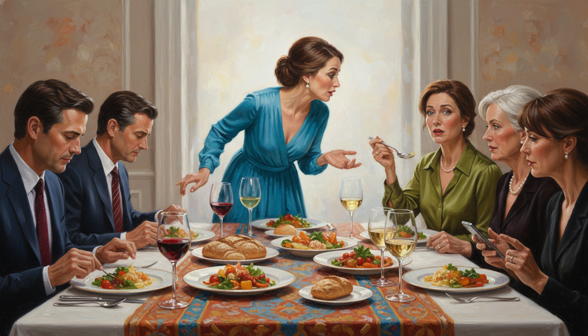 Всё. Ужин был испорчен. Не потому что вопрос страшный. А потому что за столом есть негласный договор — и она его только что нарушила.