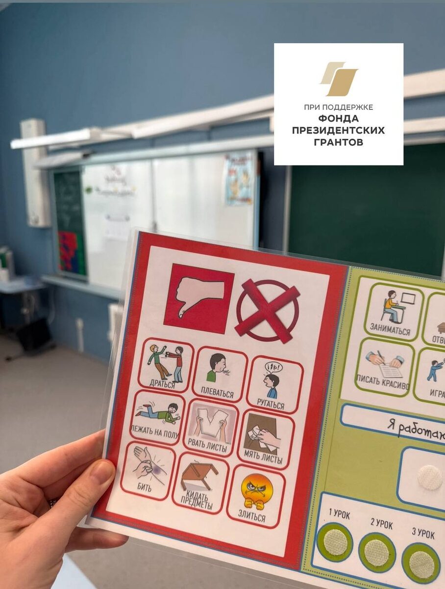 ». Здесь дети с аутизмом учатся вместе со сверстниками — это выстроенная система инклюзивного образования . 👩💻В основе — поведенческие стратегии, которые помогают ребёнку понимать правила и справляться с учебой. 🔹 Учебные договоры — ребёнок знает, что сейчас будет и что от него ждут. 🔹 Жетонная система — наглядная мотивация: сделал — получил — двинулся дальше. 🔹 Навык попросить о помощи — без этого в школе трудно. 🔹 Навык попросить перерыв — когда сенсорная перегрузка и нужно выдохнуть. Чтобы такие навыки формировались быстрее, нужны понятные визуальные опоры. Осваивать материал ученикам помогают пособия АВА.PRINT, предоставленные классу. Рядом — тьюторы, которые помогают применять стратегии прямо на уроке или перемене. Проект «Равные возможности-общий успех. Инклюзивное образование» реализуется при поддержке Фонда Президентских грантов.