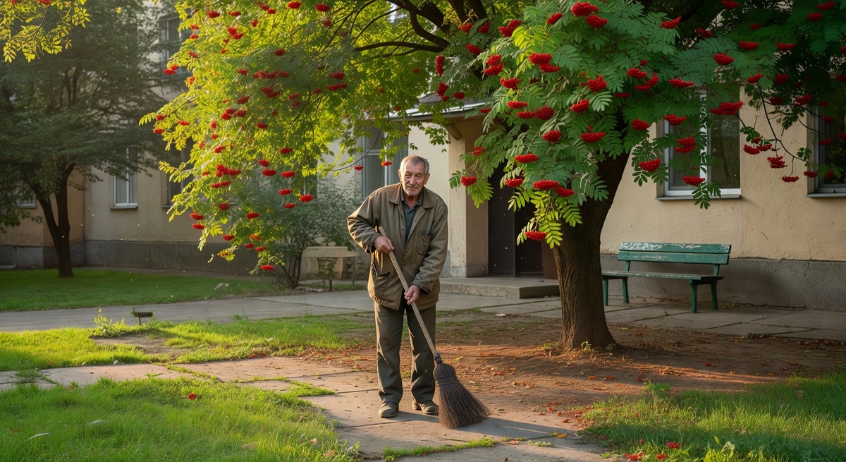 Он продолжал мести каждое утро. Та же метла с синей изолентой. Тот же маршрут: сначала вокруг детской площадки, потом вдоль дорожки к магазину, потом – под рябиной. Под рябиной он всегда задерживался. На минуту, не больше. Просто стоял. Голову не опускал, не шептал ничего. Но и не уходил сразу.