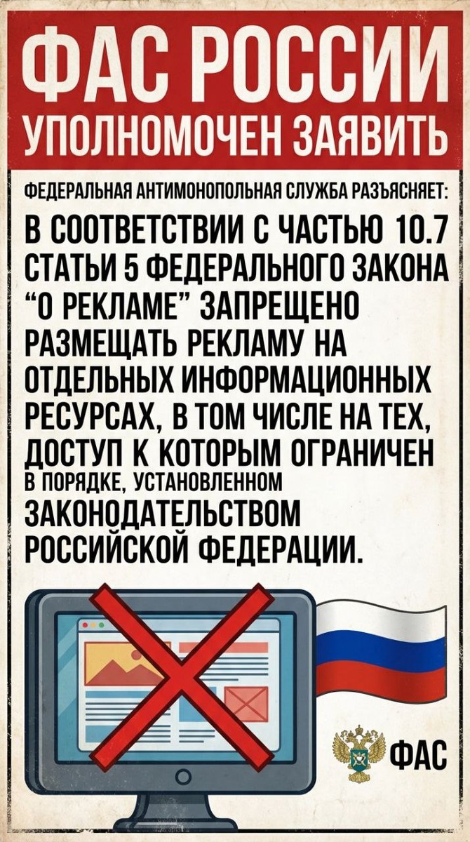 Федеральная антимонопольная служба разъясняет, что в соответствии с частью 10.7 статьи 5 Федерального закона «О рекламе» запрещено размещать рекламу на отдельных информационных ресурсах, в том числе на тех, доступ к которым ограничен в порядке, установленном законодательством Российской Федерации. Решения об ограничении доступа к тем или иным ресурсам принимает Роскомнадзор. Это происходит на основании следующих нормативных актов: – Федерального закона от 28.12.2012 № 272-ФЗ «О мерах воздействия на лиц, причастных к нарушениям основополагающих прав и свобод человека, прав и свобод граждан Российской Федерации»; – Федерального закона от 25.07.2002 № 114-ФЗ «О противодействии экстремистской деятельности»; – Федерального закона от 06.03.2006 № 35-ФЗ «О противодействии терроризму»; – Федерального закона от 27.07.2006 № 149-ФЗ «Об информации, информационных технологиях и о защите информации»; – Федерального закона от 07.07.2003 № 126-ФЗ «О связи». После введения Роскомнадзором ограни