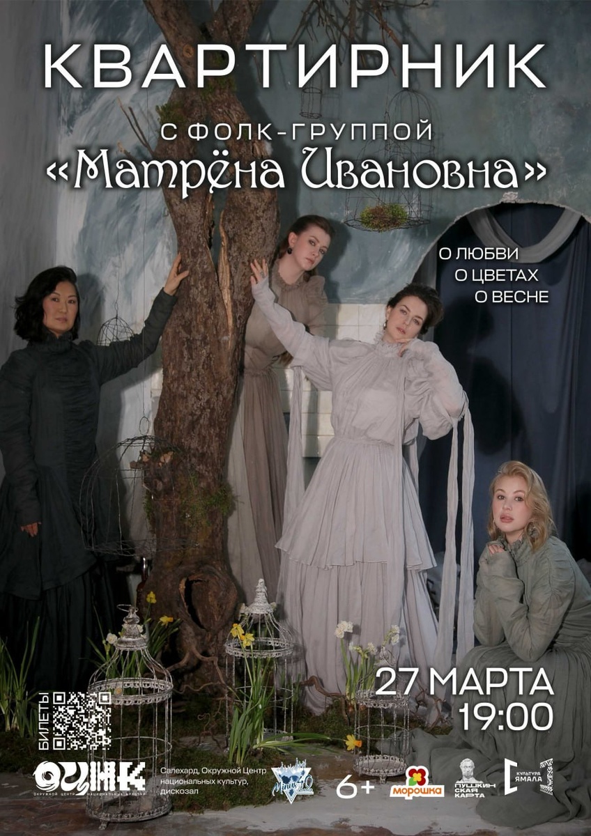 »! 27 марта в 19:00 в Окружном Центре национальных культур состоится по-настоящему тёплая встреча. В уютном зале собираемся с фолк-группой «Матрёна Ивановна» и специальными гостями — группой «Минус 40»! О чём споём? О любви 💛 О цветах 🌸 О весне ☀️ 🎫 Билеты уже в продаже:👉 https://clck.ru/3STGPj 💳 Для держателей карты «Морошка» — скидка 20%! Присоединяйтесь к месту встречи с друзьями. КВАРТИРНИК ОЦНК — здесь звучат не только песни, но и сердца. #ОЦНК #Квартирник #МатрёнаИвановна #Минус40 #Фолк #Концерт #Салехард #Морошка #МузыкальныйВечер