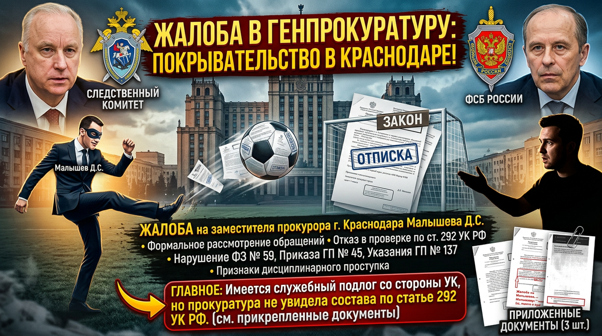 ЖАЛОБА на незаконные действия (бездействие) заместителя прокурора города Краснодара Малышева Д.С., выразившиеся в формальном рассмотрении обращений, необоснованном отказе в проведении проверки по признакам преступления, предусмотренного ст. 292 УК РФ, нарушении требований ФЗ № 59-ФЗ, Приказа ГП РФ № 45 и Указания Генерального прокурора РФ № 137/9, а также на наличие в действиях Малышева Д.С. признаков дисциплинарного проступка