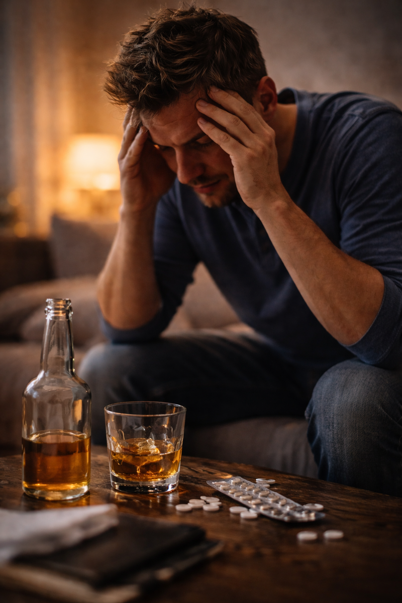 стресс → алкоголь → облегчение. Проблема начинается позже. Алкоголь — депрессант. После его выведения нервная система не просто возвращается в исходное состояние. Она компенсаторно «перегибает» в другую сторону. Снижается уровень ГАМК.