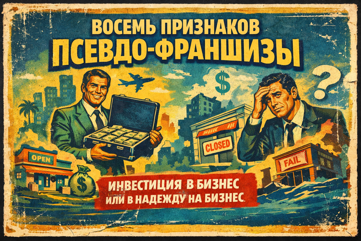 Инвестиция в бизнес или в надежду на бизнес Псевдо-франшизы на рынке примерно как фастфуд в аэропорту. Много, дорого и не особо полезно. На рынке франшиз много красивых презентаций и обещаний быстрого дохода. Но не всё, что продаётся как бизнес, действительно им является. Часто вы покупаете не готовую систему, а надежду. В этом блоке мы разберём восемь признаков псевдо-франшизы, которые помогут понять, стоит ли инвестировать свои деньги и время, или вы участвуете в чужом эксперименте. Типичная картина: Это не франчайзинг. Это продажа гипотезы. Если бизнес зарабатывает на: а не на операционной сети. Это тревожный сигнал. В нормальной модели основной доход сети — роялти. Иногда встречается прекрасное: компания продаёт франшизы, но сама точки не открывает. Логика уровня: «мы продаём рецепт ресторана, но готовить не будем». Например: В итоге сеть превращается в: набор независимых точек с одинаковой вывеской. Партнёру продают: После чего он остаётся один на один с бизнесом. Это называется н
