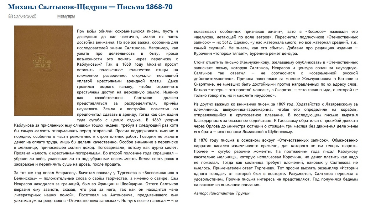 Михаил Салтыков-Щедрин — Письма 1868-70 | Критика