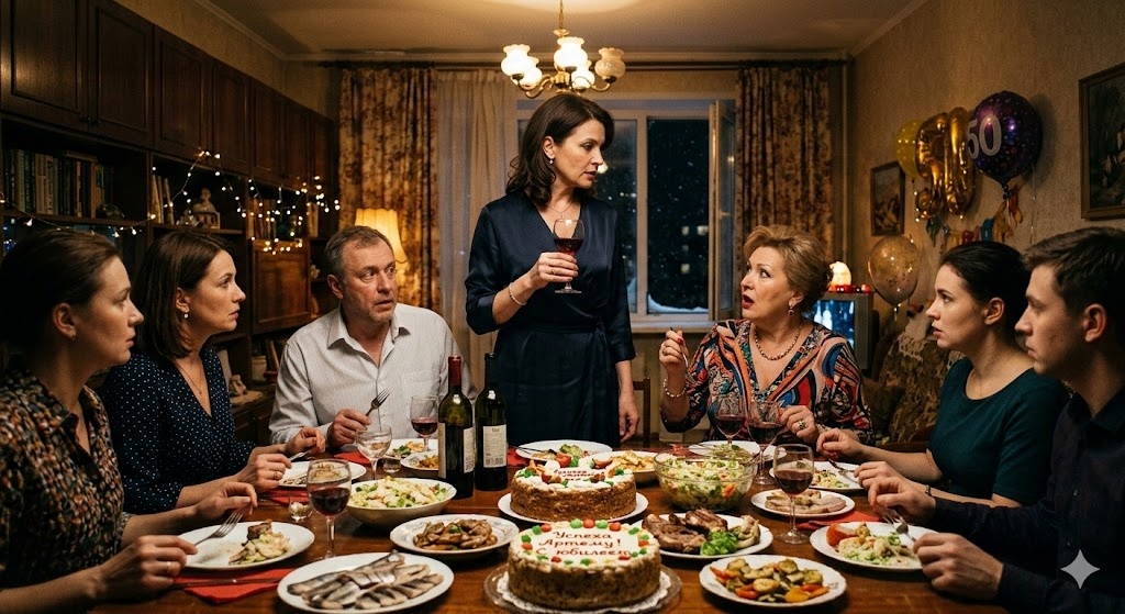 — Я хочу сказать тост, — произнесла Вера. Её голос был негромким, но в нем появилось нечто такое, что заставило Игоря, мужа, напрячься и отложить вилку.