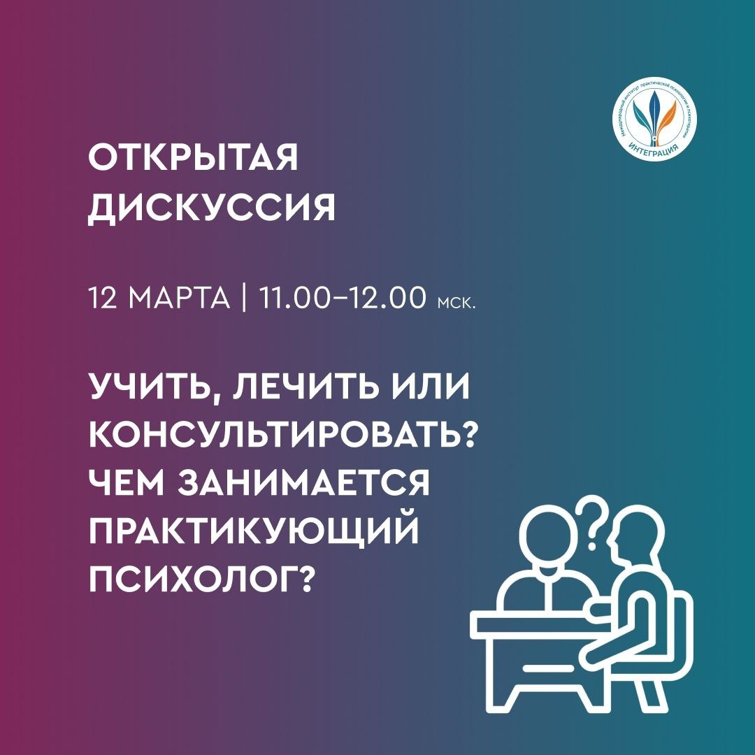 ? Онлайн-дискуссия о роли психолога Практическая психология — молодая и стремительно развивающаяся сфера, в которой даже специалистам бывает сложно определить границы своей работы. Клиенты часто ждут от психолога советов, руководства, воспитания или лечения... Но в чем на самом деле заключается его задача? Мы приглашаем вас на открытую онлайн-дискуссию, где вместе разберём: 🔹 Чем практический психолог занимается, а чем нет? 🔹 Почему он не учитель, не врач и не гуру? 🔹 Как отличить психологическую помощь от непрошеных советов? 🔹 Как специалисту чётко донести свою роль до клиента? Присоединяйтесь к разговору, чтобы наконец прояснить: Кто такой психолог и зачем к нему идут? Ведущая дискуссии - Аниса Азизова. Эксперты: - Константин Дуплищев, - Ирина Баженова, - Сергей Богута, - Юлия Герлинская 📅 12 марта в 11 ч. мск 📍 Онлайн 🔗Регистрация