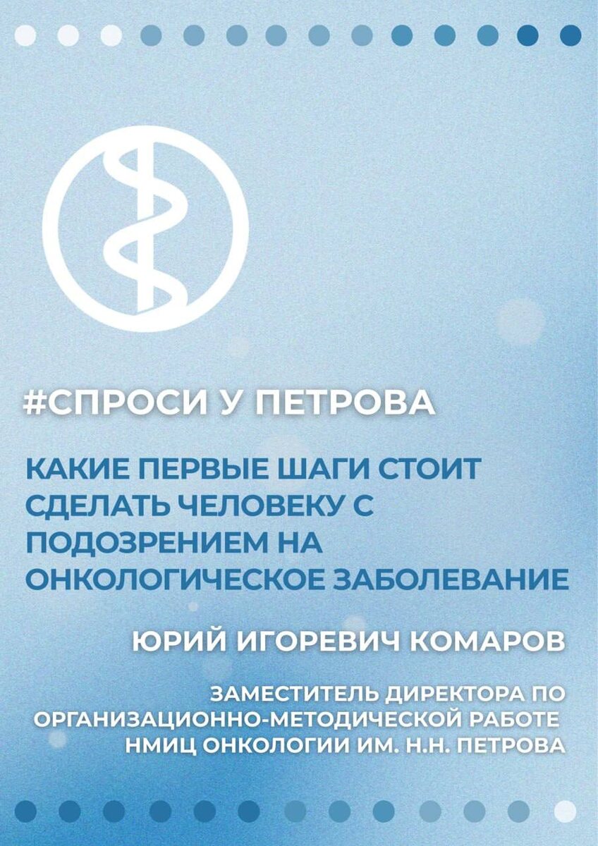 ? Разбираем алгоритмы действия для пациентов, которые столкнулись с онкологическим диагнозом. Вместе с Юрием Игоревичем Комаровым — заместитель директора по организационно-методической работе НМИЦ онкологии им. Н.Н. Петрова, — в карточках объясняем: 🔹 Какие первые шаги стоит сделать человеку с подозрением на онкологическое заболевание? 🔹 Что делать, если у пациента есть сомнения в установленном диагнозе или методе лечения? 🔹 Как избежать избыточных обследований? 🔹 Обязательно ли специалистам из регионов получать мнение федерального центра? Смотрите последний выпуск «Спроси у Петрова» по ссылке. И помните: если вам нужна консультация наших специалистов — вы можете записаться на приём по общему номеру телефона +7(812)43-99-555 или через обратную форму на сайте.