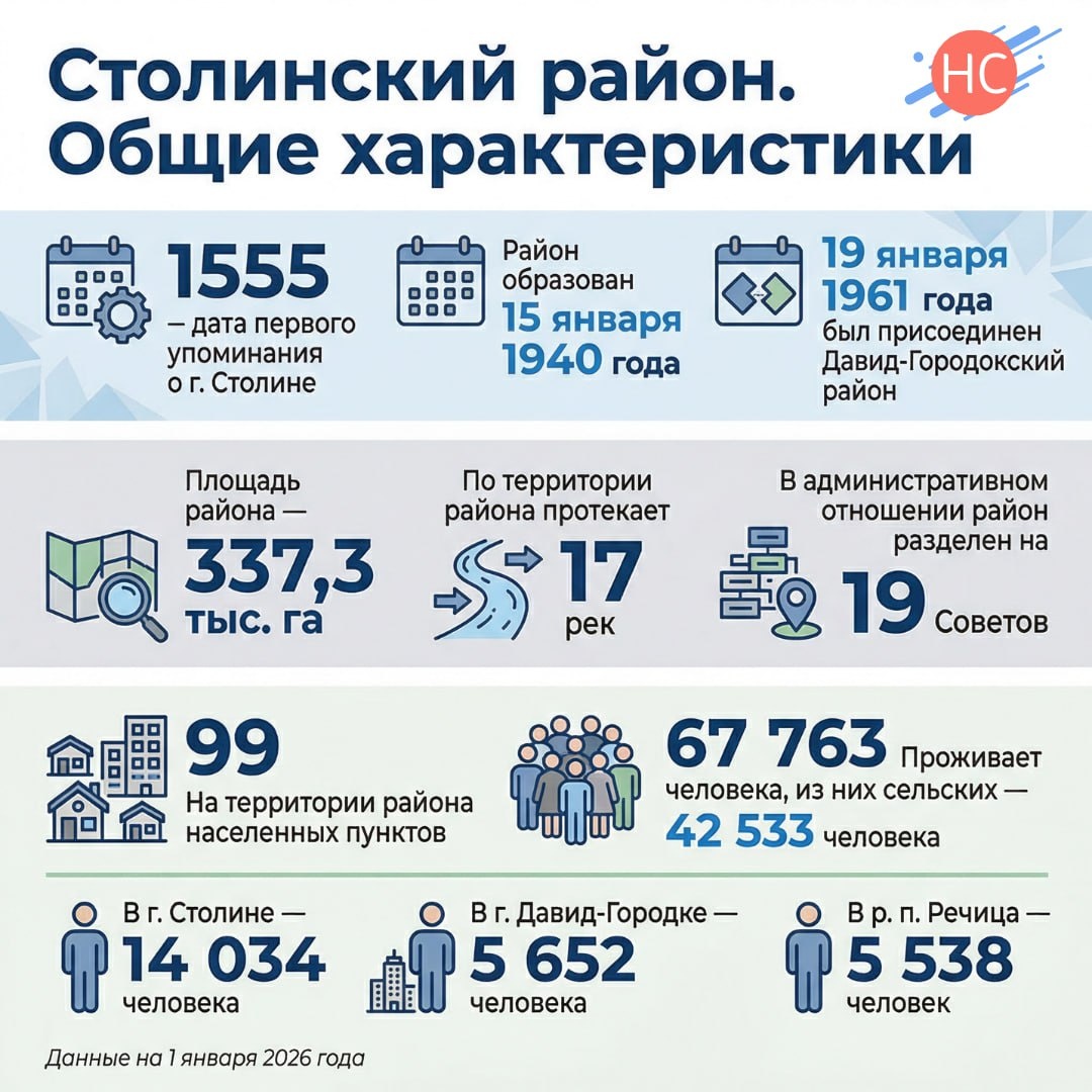 ! 👋 Мы тут подумали: мы много рассказываем о новостях, событиях, погоде. 🏡 Пришло время запустить для вас большую и очень душевную серию инфографик о Столинском районе. Хочется рассказать обо всём, что интересно и важно каждому, кто живёт на Столинщине. Чтобы было наглядно, честно и с душой. 😁 Итак, открываем серию самым главным - ОБЩЕЙ ИНФОРМАЦИЕЙ 📊 Знаете ли вы, например, что Столин впервые упомянули в летописях аж в 1555 году? А что у нас протекает 17 рек, а живёт почти 68 тысяч человек? Цифры на картинке — это не просто сухая статистика. Это мы с вами. Это наша история и наша реальность. Сохраняйте этот пост себе 📲, делитесь с друзьями и знакомыми - пусть все знают, чем дышит родной край. А мы будем продолжать! Следующие посты из этой серии уже готовятся 🔥 Ставьте реакции, если ждёте продолжения и любите свой район! 👇❤️ Все данные на 1 января 2026 года