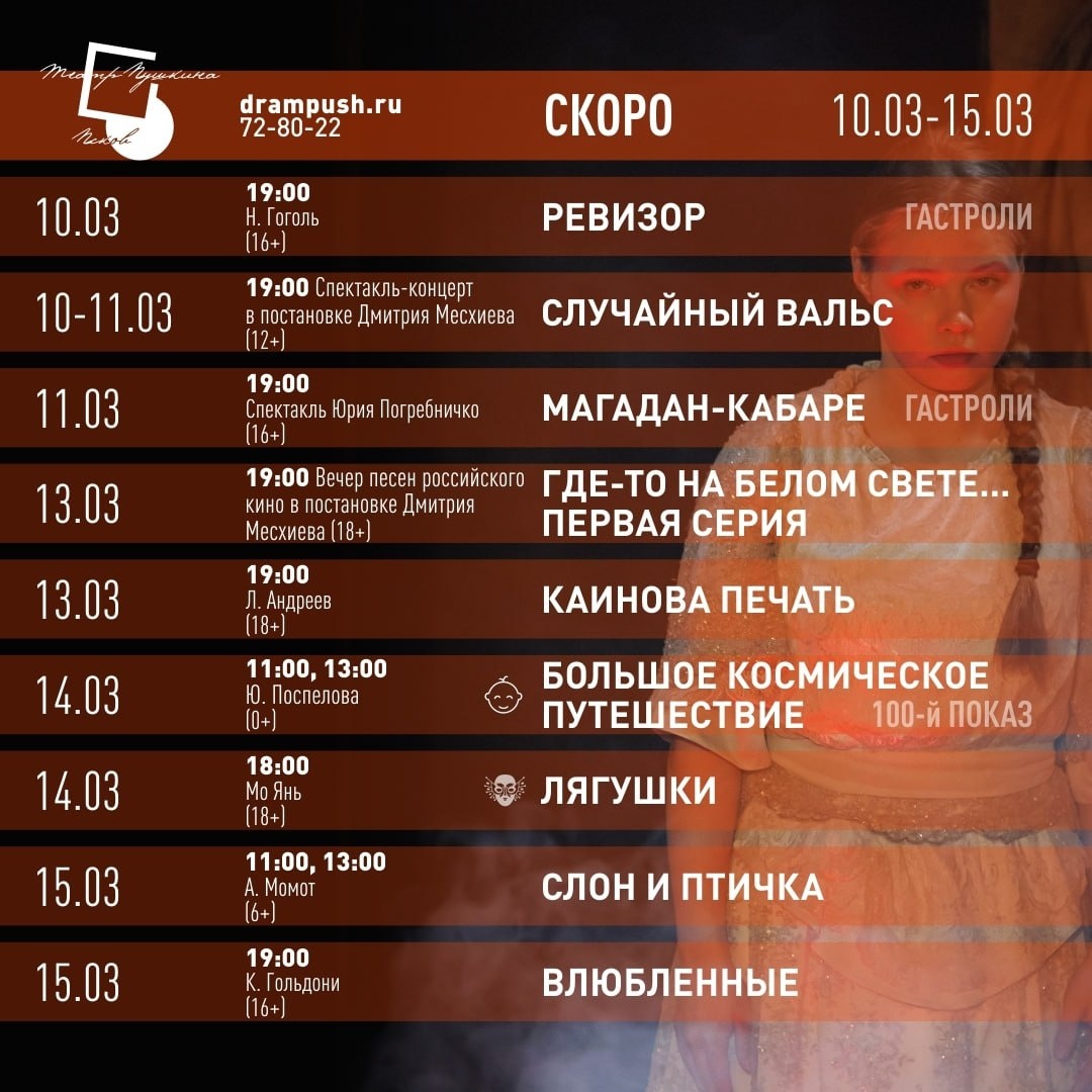 А. С. Пушкина 🎭 ✨ Неделю театральных представлений откроют гастроли театра «Около дома Станиславского». Затем зрителя ждут самые популярные постановки: музыкальные спектакли «Где-то на белом свете…» и «Случайный вальс» в постановке Дмитрия Месхиева, итальянскую комедию «Влюбленные», эпическую драму по роману китайского писателя Мо Яня «Лягушки» и мистический триллер «Каинова печать». 🎈 В выходные пройдут спектакли для детей. Оставайтесь с нами #НашаПсковскаяобласть