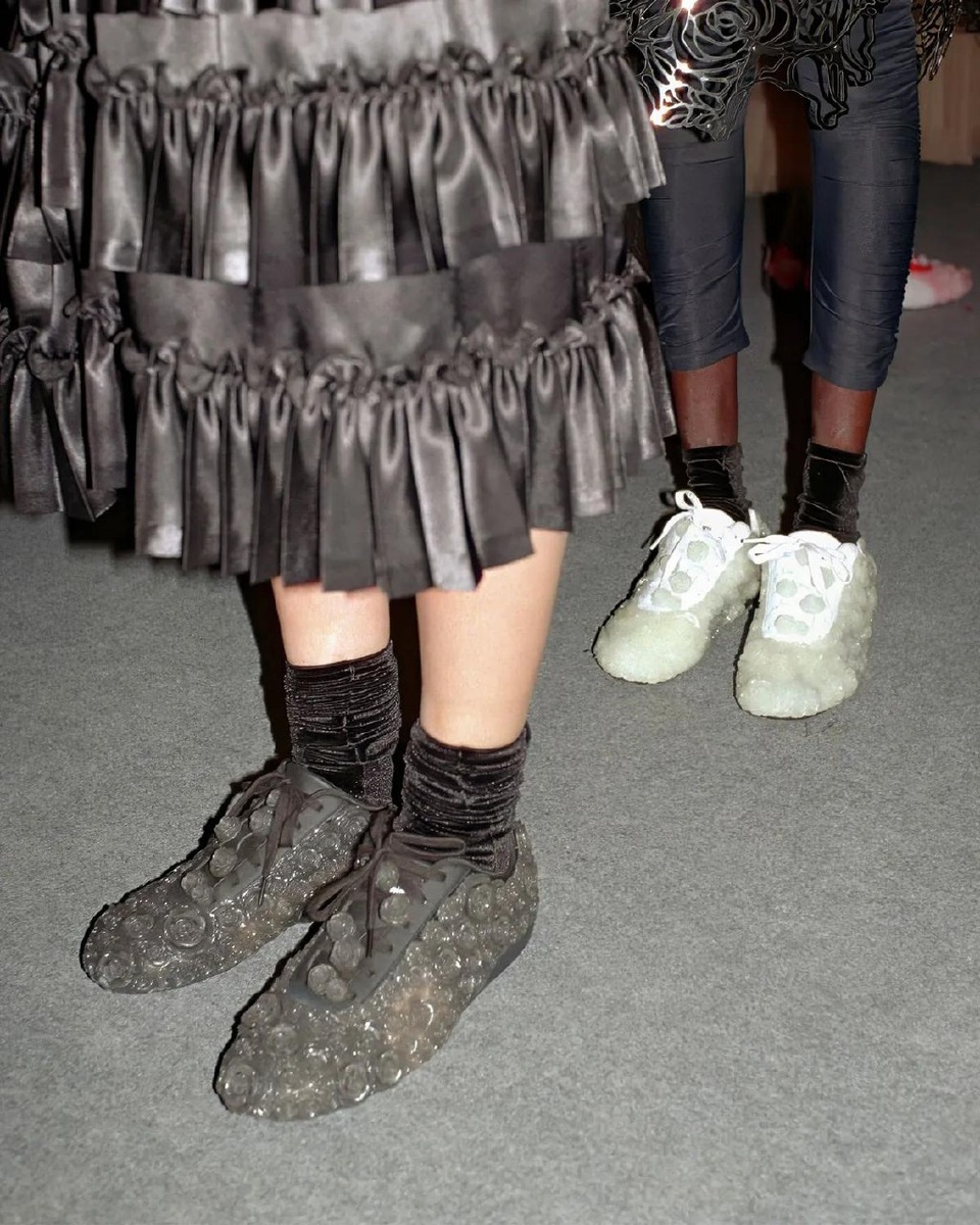 🌹 На показе новой коллекции Noir Kei Ninomiya представили коллаборацию с PUMA на базе модели Speedcat, где классический силуэт получил авангардное обновление. Верх кроссовок покрыли прозрачной оболочкой с объёмными 3D-розами, при этом фирменная полоска остаётся видимой под декором.
