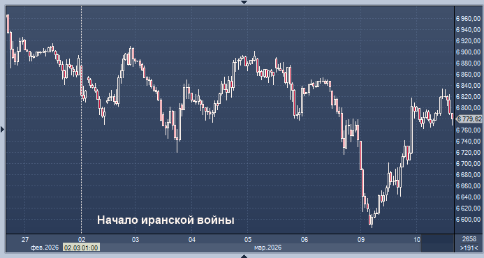 Конфликт между США и Ираном оказал давление на фондовые рынки и привел к росту цен на нефть. По словам Марко Папича из BCA, для того чтобы Трамп отошёл от темы войны с Ираном, индекс S&P 500 должен упасть как минимум на 10%. Папич — эксперт в области геополитики и главный стратег компании BCA Research. График фьючерса на индекс S&P 500 интервалами в 1 час На прошлой неделе фондовый рынок испытал значительное колебание из-за обострения конфликта между США и Израилем с одной стороны и Ираном с другой. Вопрос о том, насколько глубоким должно быть падение рынка, чтобы это стало болезненным для президента Дональда Трампа, остаётся открытым. Марко Папич, геополитический эксперт и главный стратег BCA Research, считает, что акции должны пройти через серьёзную коррекцию, прежде чем Трамп начнёт пересматривать свою стратегию в отношении Ирана. «Для того чтобы гарантировать запуск опциона пут, индекс S&P 500 должен снизиться более чем на 10%», — отметил Папич в своём письме клиентам в среду. Он т