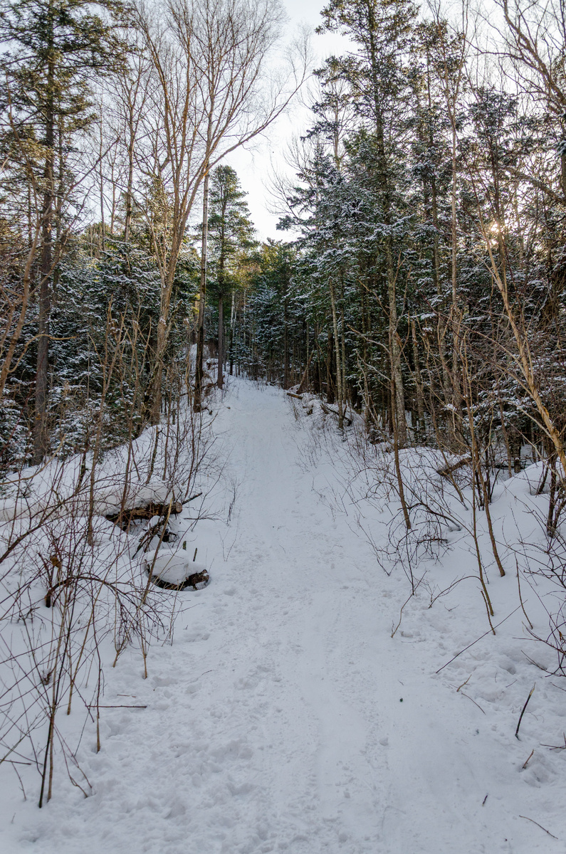 Увы, вершина сопки пологая и покрыта почти сплошным лесом. Есть несколько просветов, оставшихся от лесозаготовителей, сквозь которые удалось снять хоть что-то. Этому факту я не сильно расстроился, т.к. это было известно заранее. А до видовой площадки на южную сторону я уже не стал пробираться сквозь толщу снега.