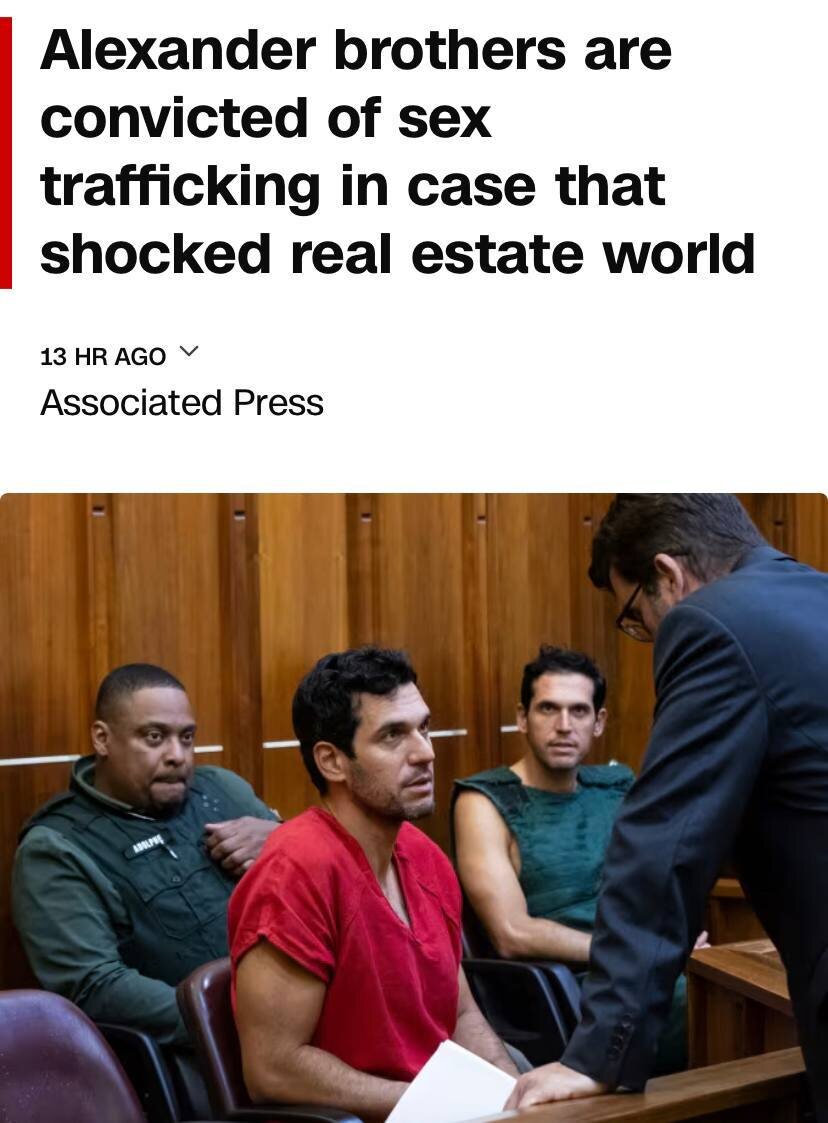 Трое братьев Александер, включая двух успешных брокеров элитной недвижимости в США, признаны виновными в торговле людьми и сексуальных нападениях на десятки женщин, которых они заманивали роскошью и деловыми связями в мире недвижимости. Жертвы рассказывали о насилии на вечеринках, круизах и поездках в Хэмптоне, Аспен и Карибском регионе, часто с использованием наркотиков и принуждения. Дело показало темную сторону индустрии элитной недвижимости, где домогательства и злоупотребления властью долгое время оставались известным секретом. Судебные материалы включают переписку братьев о преступлениях и видеозаписи нападений, что усиливает скандальный резонанс в сфере недвижимости. 🔺Треугольный метр