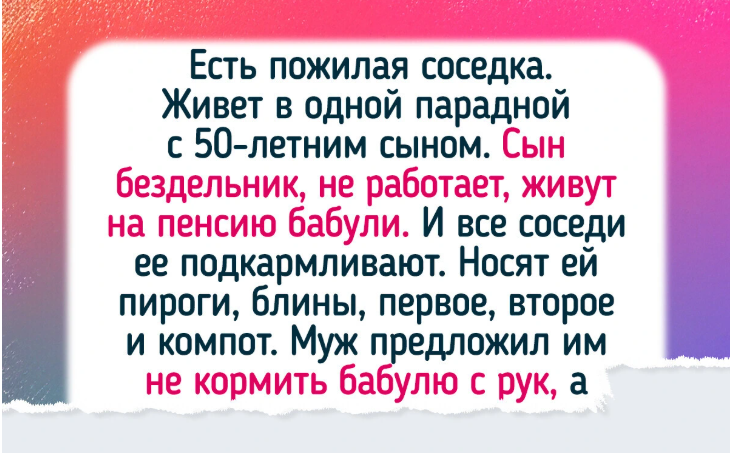 - Есть пожилая соседка. Живет в одной парадной с 50-летним сыном. Сын бездельник, не работает, живут на пенсию бабули. И все соседи ее подкармливают. Носят ей пироги, блины, первое, второе и компот. Муж предложил им не кормить бабулю с рук, а заявить в соцзащиту. В итоге сын дома, оказывается, работает за компьютером. Мамаша, естественно, работой это не считает. Надо же на нее ходить! А не дома сидеть. И давай всем соседям заливать про свою жизнь несчастную.